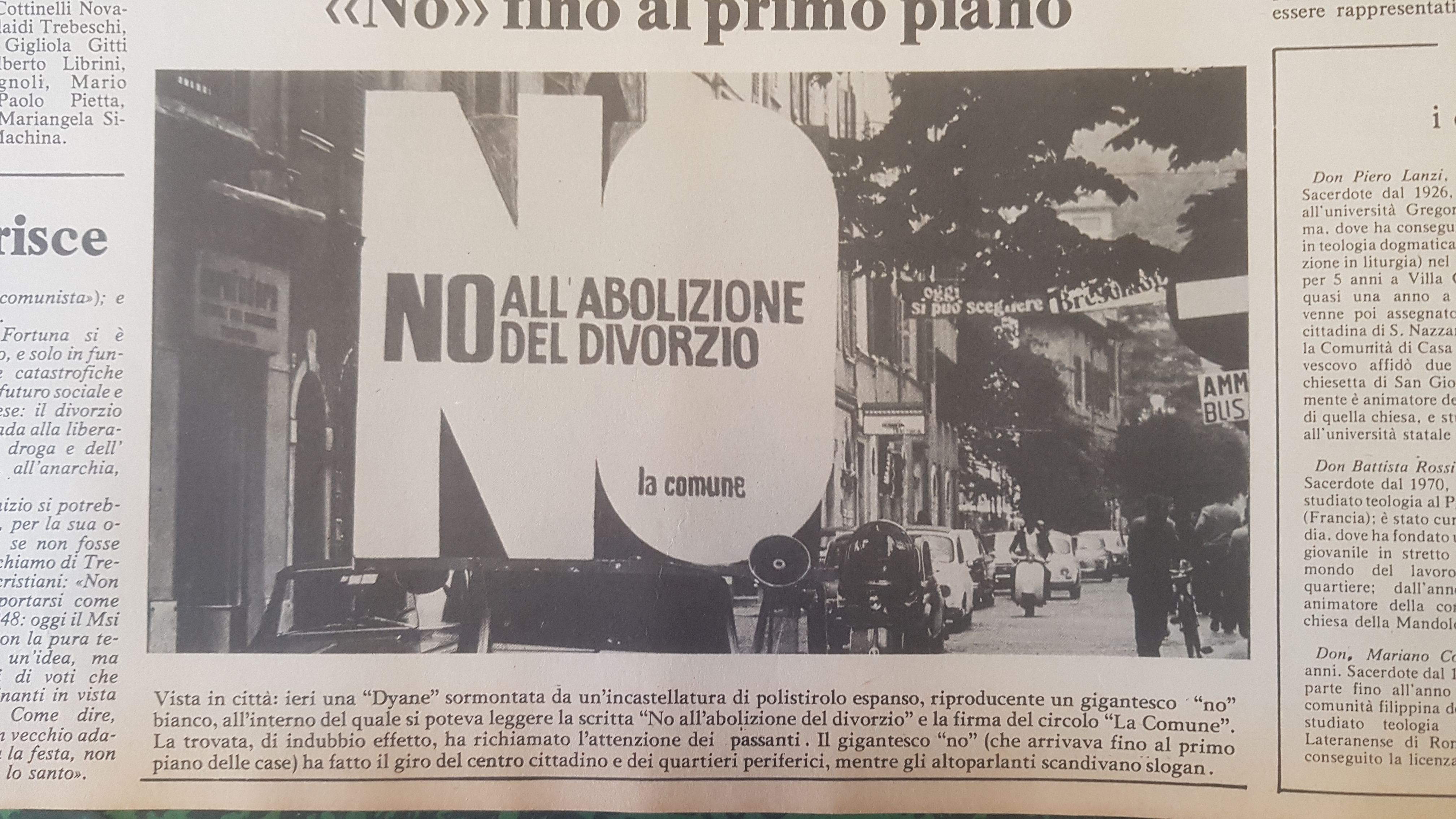 Sempre BS oggi, il 9 maggio, dà conto dello sciopero contro i decreti delegati organizzato dagli studenti delle superiori di Palazzolo s/O. E il giorno dopo, con una fotografia (con didascalia) che riprende il gigantesco NO all’abolizione del divorzio creato dal Circolo “La Comune”, sarà di nuovo BS Oggi a “coprire” mediaticamente le iniziative dell’estrema sinistra (11). In altra pagina, lo stesso giorno, figura il comunicato del Collettivo degli studenti dell’Arnaldo (vicino al Manifesto) di appoggio all’appello dei “cento insegnanti per il NO”.