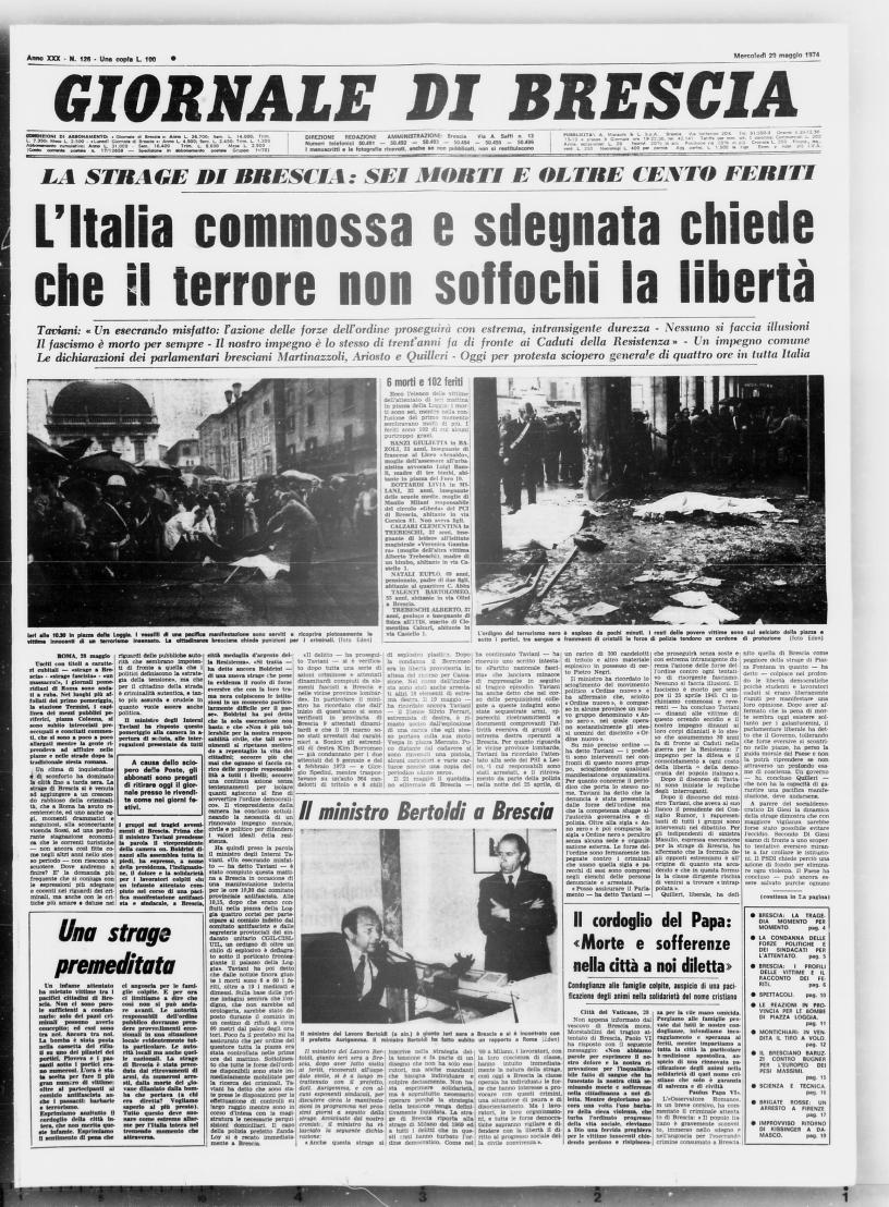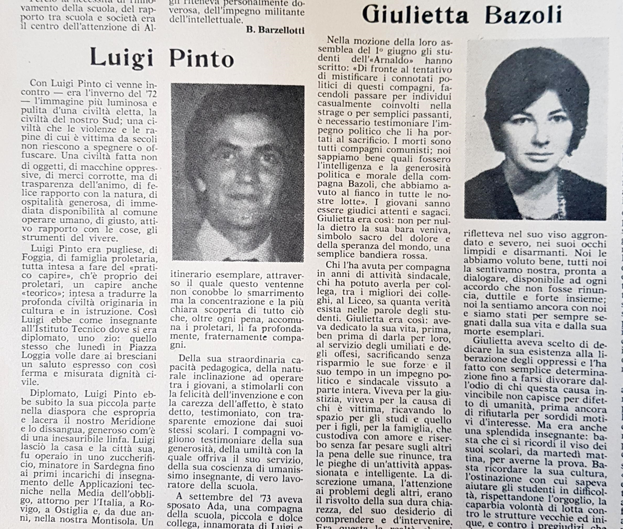 Dalla lettera di Silvana Balletti (dirigente del Manifesto) a Bsoggi del 4 giugno, apprendiamo della contestazione alla messa cattolica inscenata dalle autorità (politiche e religiose), “che i sei compagni morti non avrebbero potuto avallare”, a cui moltissimi avrebbero risposto intonando L’Internazionale. Nella stessa rubrica viene ospitata una lettera firmata da AO, LC e Radicali in cui si sottolineano le responsabilità degli apparati dello Stato, chiedendo le dimissioni di Taviani, Arcai e Mastronardi (18). Il giorno successivo Bsoggi riporta un documento del Comitato Antifascista di Tartaglia ed Abba chiaramente influenzato dall’estrema sinistra (MSI fuorilegge, epurazione dello Stato, attacco alla DC, ecc.).