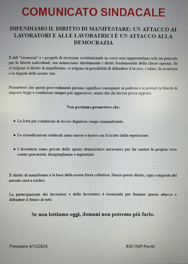 Sabato prossimo l’assemblea contro il ddl liberticida 1660, che riunisce decine di organizzazioni politiche, sindacali, collettivi, ecc. manifesterà, per la seconda volta (dopo la partecipazione allo sciopero generale del 29/XI) contro questa legge fascistoide. Nei limiti delle nostre forze parteciperemo a questa importante scadenza, insieme agli altri compagni del neonato coordinamento contro il DDL 1660, agli operai della IMP Pasotti di Pompiano (vedi il loro comunicato qui sotto) e a tutte le realtà che si battono contro la repressione.