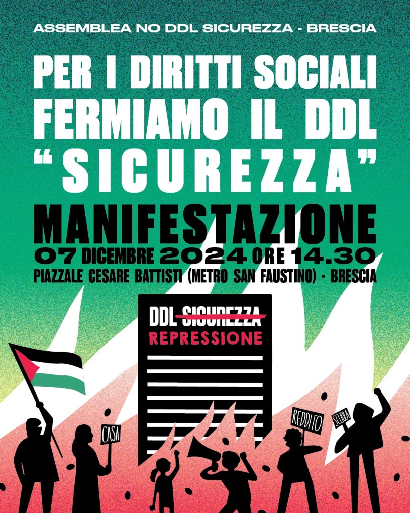 Sabato prossimo l’assemblea contro il ddl liberticida 1660, che riunisce decine di organizzazioni politiche, sindacali, collettivi, ecc. manifesterà, per la seconda volta (dopo la partecipazione allo sciopero generale del 29/XI) contro questa legge fascistoide. Nei limiti delle nostre forze parteciperemo a questa importante scadenza, insieme agli altri compagni del neonato coordinamento contro il DDL 1660, agli operai della IMP Pasotti di Pompiano (vedi il loro comunicato qui sotto) e a tutte le realtà che si battono contro la repressione.