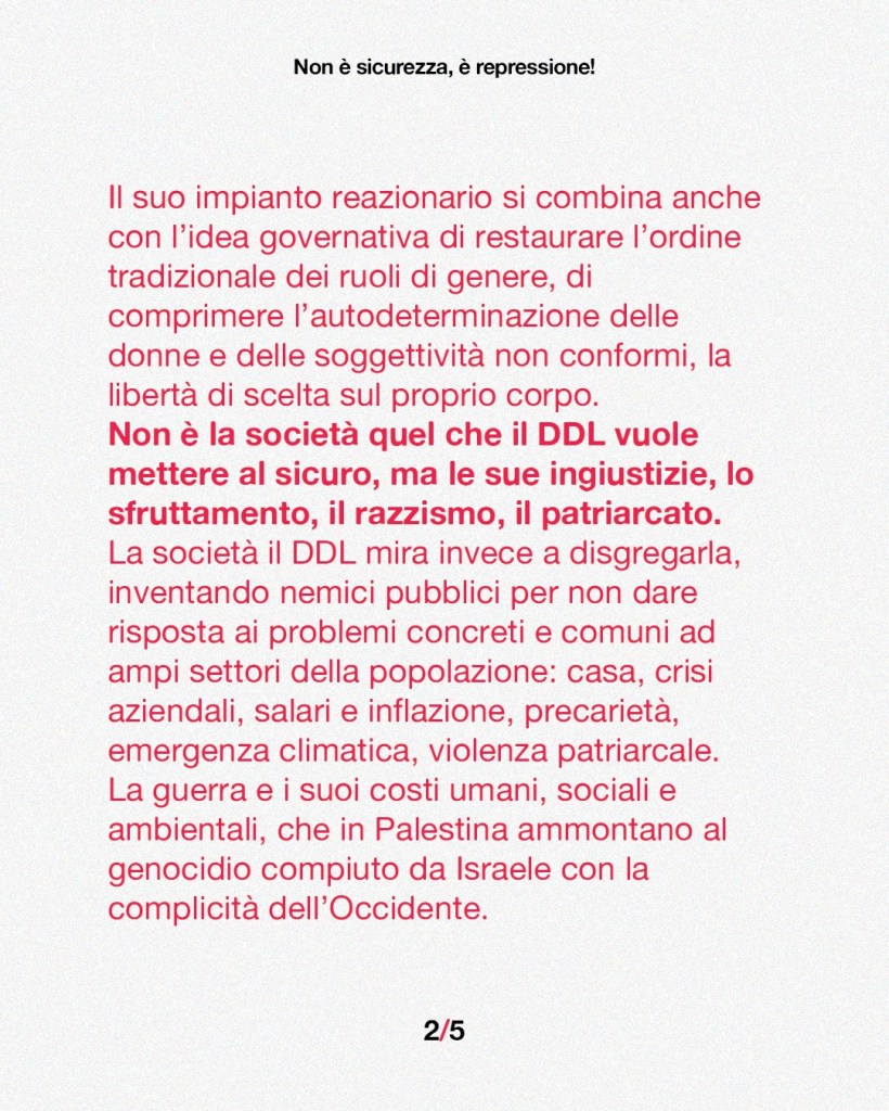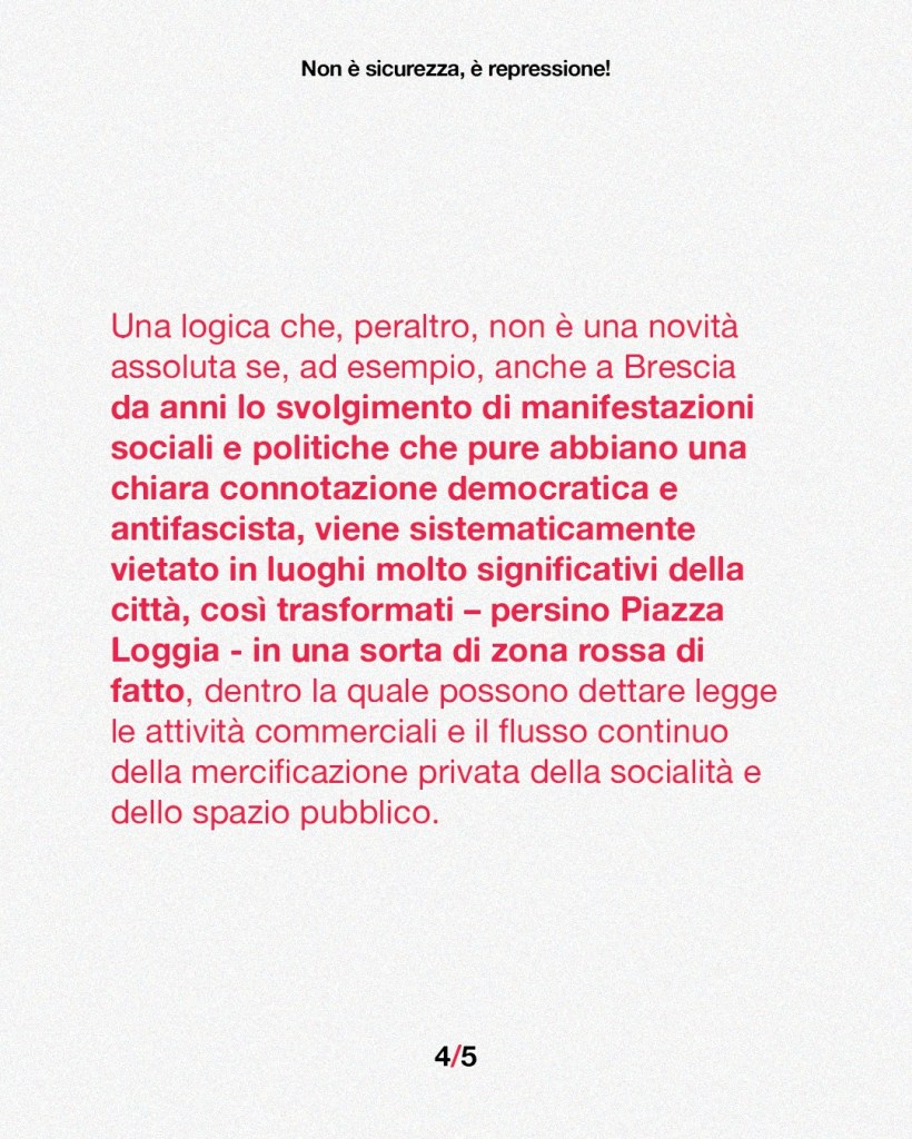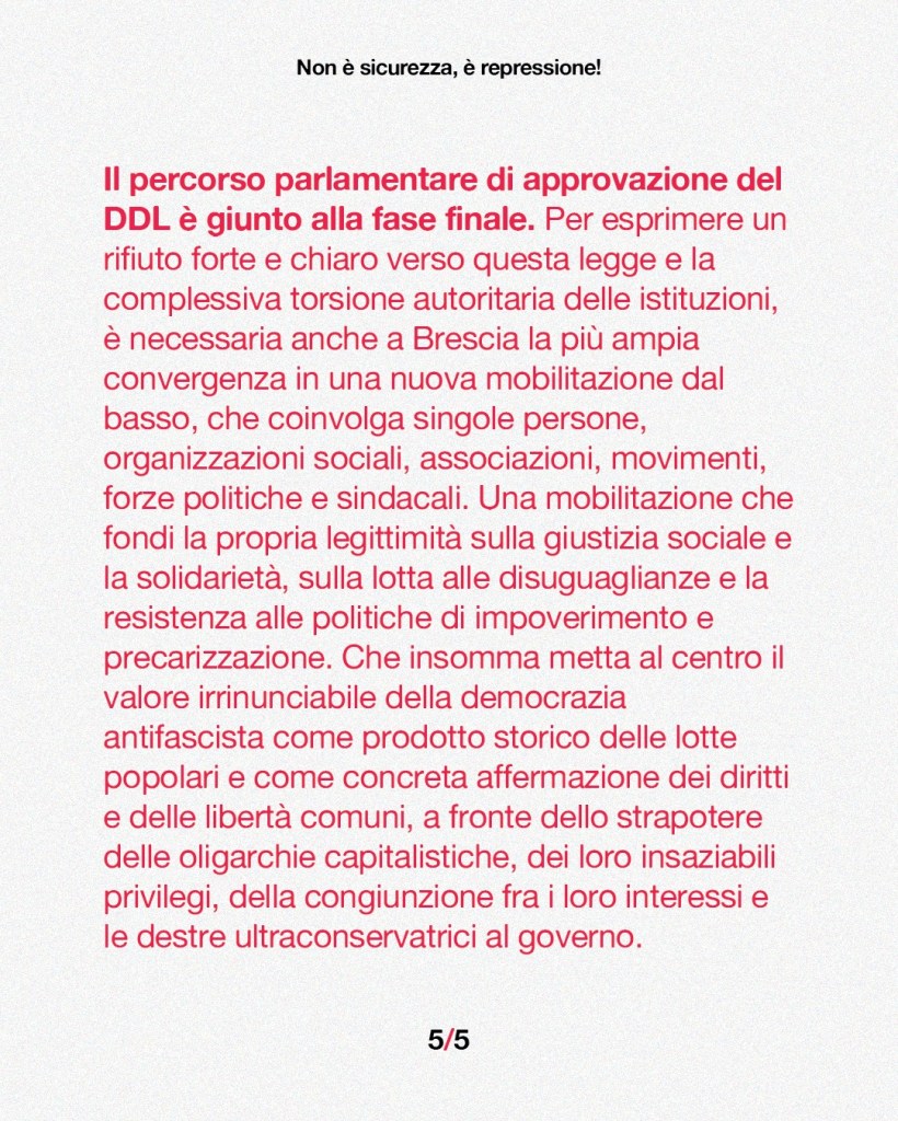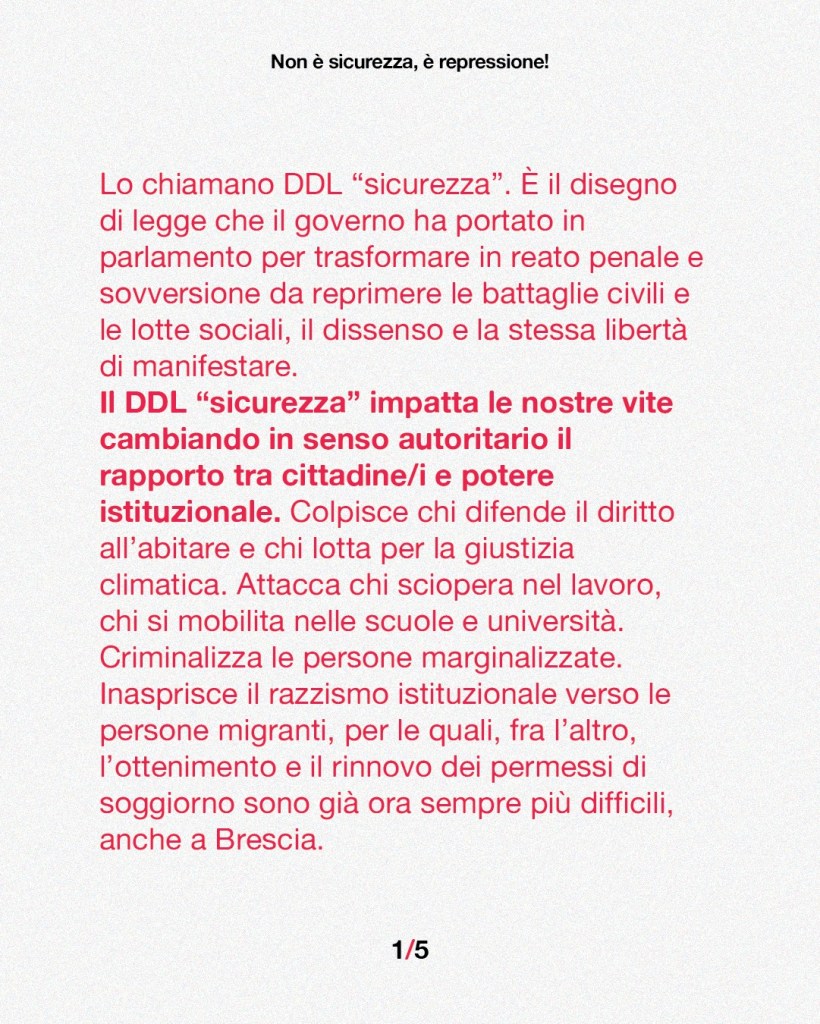 Ecco il testo approvato dall’assemblea unitaria, che riunisce quasi tutte le forze politiche e sindacali della sinistra bresciana, contro il famigerato DDL Repressione (1660).