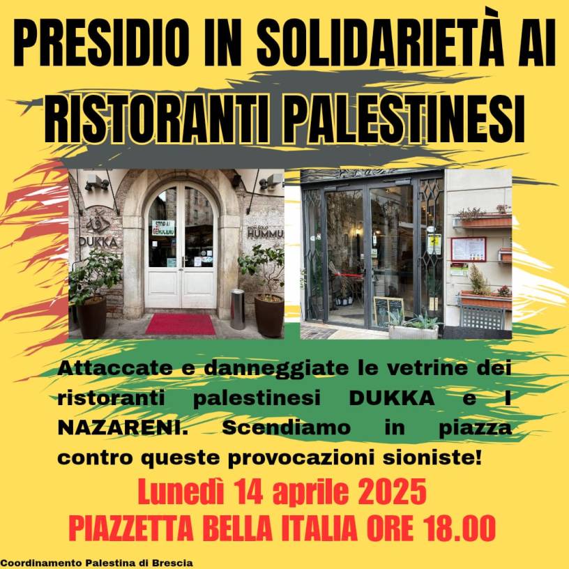 La scorsa notte due ristoranti palestinesi del centro storico di Brescia (I Nazareni e Dukka, quest’ultimo gestito dal consigliere comunale di maggioranza Iyas Ashkar, già oggetto di “attenzione” da parte della destra bresciana per il suo impegno a fianco dei palestinesi) hanno avuto le loro vetrine incrinate, nel tentativo di infrangerle per poter entrare e devastare ulteriormente i locali. Che all’origine di questi attacchi ci sia l’estrema destra tradizionale, storicamente antisemita, o la nuova estrema destra filo-sionista (che in ultima analisi fa il gioco dell’antisemitismo più becero e squallido) non è particolarmente importante. Certamente non si tratta di delinquenza “comune”. Il messaggio, se di “messaggio” si può parlare, è ovviamente politico: poche ore dopo l’aggressione delle “forze dell’ordine” al corteo di Milano contro il massacro a Gaza, qualcuno ha voluto “punire” chi si è schierato (anche esponendo in vetrina messaggi di solidarietà con le vittime di Gaza e Cisgiordania) contro la brutale guerra di aggressione del governo Netanyahu. La cosa, al di là della limitatezza dei danni materiali, è molto grave. Per questo domani, alle 18, è stato indetto un presidio di solidarietà, in Piazzetta Bella Italia (a pochi metri dai due locali danneggiati) con i gestori e i lavoratori e le lavoratrici dei due ristoranti palestinesi, a cui parteciperemo. Ributtiamo l’estrema destra, in tutte le sue componenti, nelle cloache da cui è uscita!