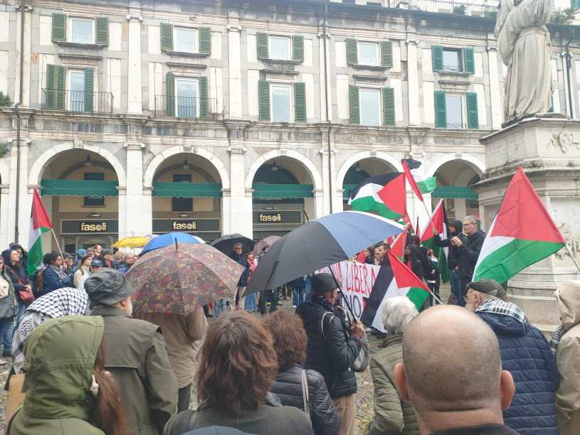 Oltre 200 persone, nonostante la pioggia e l’improvvisazione della mobilitazione, hanno partecipato nel tardo pomeriggio al presidio contro gli attacchi avvenuti durante la notte tra sabato 12 e domenica 13 ai due ristoranti palestinesi Dukka e I Nazareni, situati a pochi passi da Piazzetta Bella Italia, dove si sono concentrati i manifestanti. Presenti delegazioni, più o meno nutrite, di un po’ tutte le forze politiche della sinistra bresciana, che hanno ascoltato e applaudito gli interventi di Umberto, Mariam, Giorgio Cremaschi e Alfredo (di Italia-Palestina). Al di là degli slogan un po’ troppo trionfalisti lanciati da alcuni giovani, italiani e arabo-palestinesi, che inneggiavano ad un’Intifada che, ad oggi, è più un desiderio che una realtà (si tratta, a mio avviso, di un brutale massacro a senso unico fatto dal governo sionista, e non certo di una rivolta popolare di massa, come fu la vera Intifada dell’87 e in parte anche quella del 2000) si è trattato di una prima risposta alla provocazione fascista dell’altra notte, i cui esecutori, nonostante l’onnipresente vigilanza delle telecamere, sembrano tuttora sconosciuti. Una mobilitazione che dimostra come continui ad esistere a Brescia, nonostante una certa stanchezza dovuta ad un anno e mezzo di continue manifestazioni, una solidarietà relativamente ampia verso le sofferenze dei palestinesi, in particolare di quelli di Gaza, sottoposti ad un tentativo di genocidio neppur tanto mascherato. Come c’era da aspettarsi, assente ingiustificata la sindaca di Brescia e la giunta cosiddetta “progressista”, così silenziosa di fronte al massacro voluto dal governo Netanyahu e così solerte nell’accettare le definizioni di antisemitismo coniate dalla destra sionista. Nessuno stupore. Non ne abbiamo sentito la mancanza.