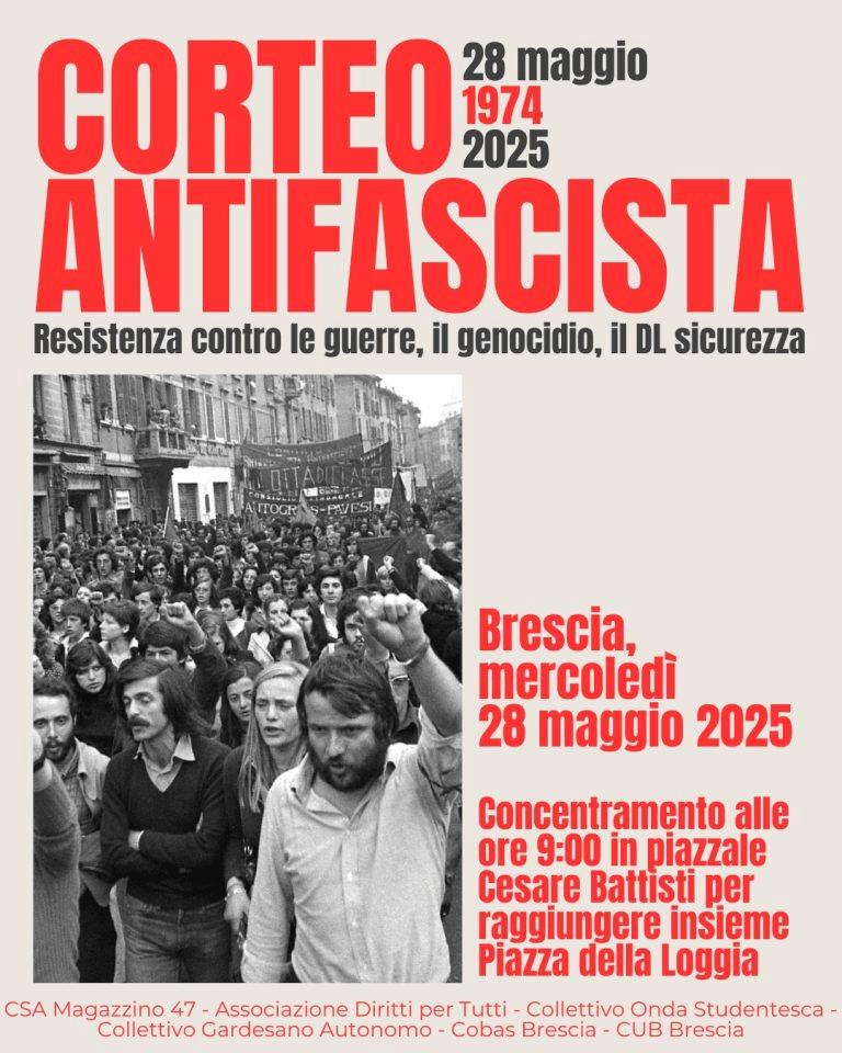 A 51 anni dalla strage fascista, di Stato e della NATO (come accertato ormai anche dalla magistratura) si svolgeranno due manifestazioni “alternative” a quella classica, stancamente istituzionale. La prima, indetta dalle organizzazioni legate al Mag47 e dai COBAS, la mattina, dalle 9 in poi, con sciopero studentesco e partenza da piazzale Cesare Battisti, e la seconda, organizzata dal Coordinamento contro il decreto sicurezza (a cui partecipano quasi tutte le realtà dell’estrema sinistra bresciana, compresa Sinistra Anticapitalista) che partirà alle 18 dal piazzale della Stazione per concludersi in Piazza Loggia, con interventi musicali durante il corteo. Brescia Anticapitalista aderisce ovviamente ad entrambi i percorsi.