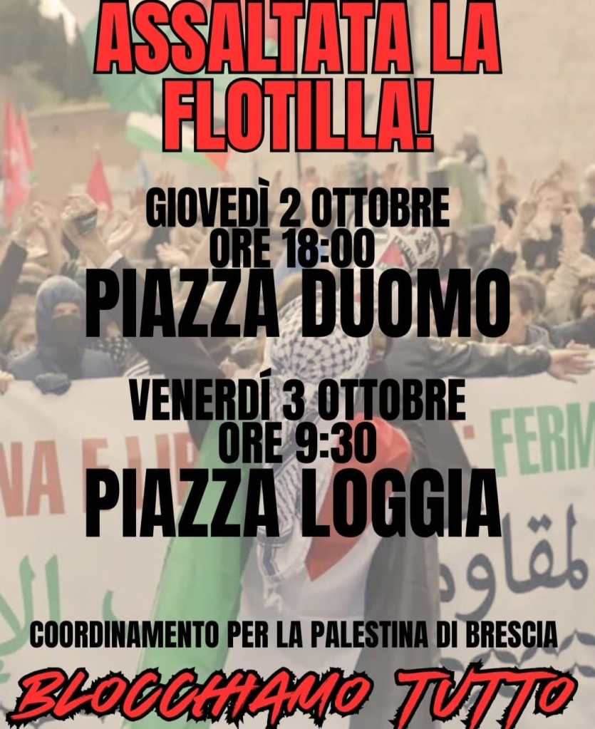 Appena giunta la notizia dell’assalto della marina israeliana contro la Sumud Flottilla, avvenuto in acque internazionali (ma nessuno con un minimo di sale in zucca aveva mai creduto al “rispetto della legalità internazionale”) centinaia di bresciani, giovani e meno giovani, si sono concentrati in piazza Duomo per manifestare il loro rifiuto dell’aggressione sionista (certo, molto più soft di quella che subiscono gli abitanti di Gaza). Slogan, bandiere, qualche intervento al megafono, capannelli per decidere il da farsi l’indomani. E si è deciso di ritrovarsi di nuovo dalle 10 di domattina al gazebo in Piazza Duomo, e alle 18 di organizzare un corteo a partire da Piazza Loggia. In attesa dell’evento più importante: lo sciopero generale unitario, proclamato da CGIL e dai sindacati di base per venerdì 3. Per una Palestina libera da TUTTE le oppressioni, laica, non-etnica, socialista!