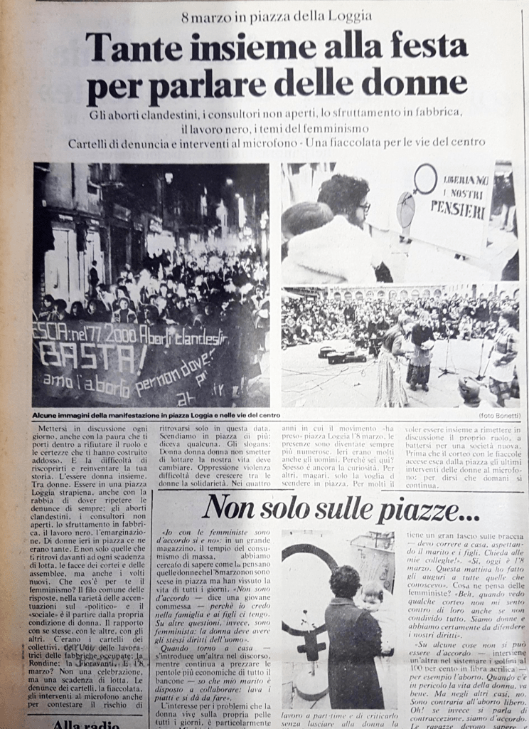 - 8 marzo. Grossa manifestazione in Piazza Loggia e corteo-fiaccolata in centro dei Collettivi femministi, dell’UDI e delle lavoratrici delle fabbriche occupate (Rondine, Fioravanti)
