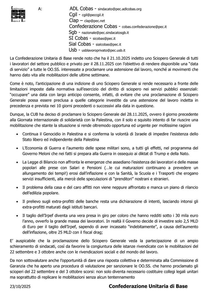 4) infine la lettera della CUB, rivolta a tutti i sindacati di base e alla Cgil.