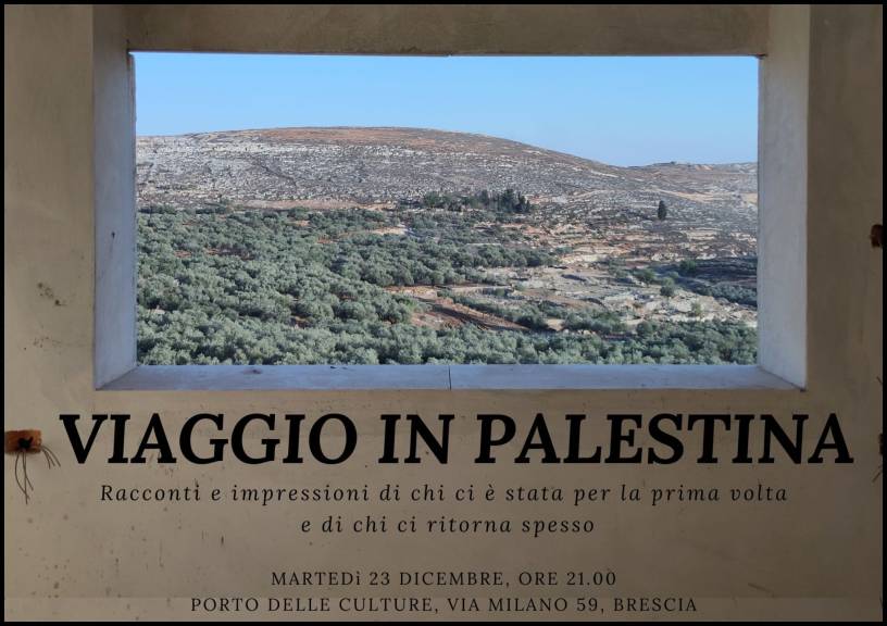 Martedì prossimo, 23 dicembre, alle 21, su iniziativa del Presidio 9 agosto e di Brescia Anticapitalista si terrà un incontro con Chiara, di ritorno dal suo viaggio a Ramallah, Gerusalemme, Nablus, Jenin e Tulkarem, e Fabian, italo-palestinese di Brescia. L’incontro si terrà al Porto delle Culture, in via Milano, 59, a Brescia. Ovviamente è aperto a tutt*