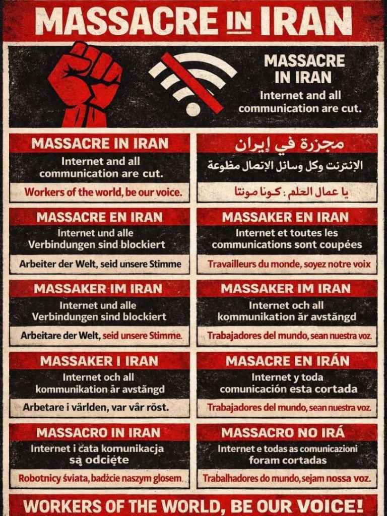 Chiediamo ai lavoratori di tutto il mondo di diventare la voce dei loro fratelli e sorelle di classe in Iran. Fate sentire la loro voce in ogni angolo del mondo. Rompete il silenzio. Diffondete la verità. Denunciate questo massacro ovunque vi troviate.