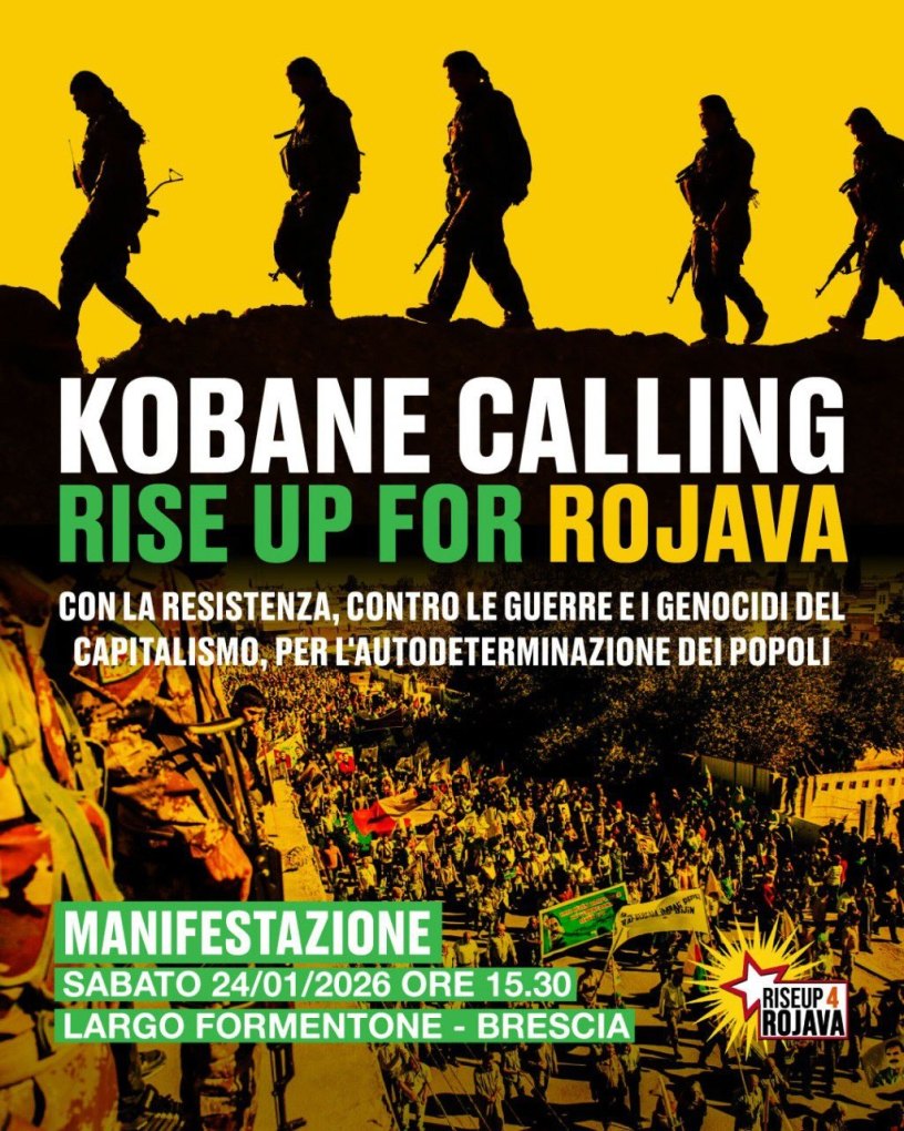 Sabato 24 gennaio a Brescia la rete Rise Up For Rojava chiama una manifestazione a sostegno della rivoluzione confederale della Siria del Nord e dell’Est, sotto attacco militare diretto da parte delle bande jihadiste di Al Jolani, autoproclamatosi presidente (a interim) della Siria, grazie all’esplicito sostegno di Turchia, Usa, Nato, Ue, Israele e regimi arabi regionali.