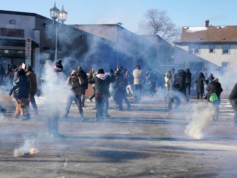 Gli agenti hanno scaraventato un manifestante sull’asfalto fangoso e gli si sono ammassati addosso, poi lo hanno ammanettato e trascinato via. Le urla si sono fatte sempre più forti. Con la via di fuga bloccata dai manifestanti e dalle loro auto, gli agenti hanno lanciato lacrimogeni, mentre le nuvole bianche si alzavano nell’aria invernale. Un uomo ferito mi è passato accanto inciampando e ha vomitato ripetutamente nella neve.