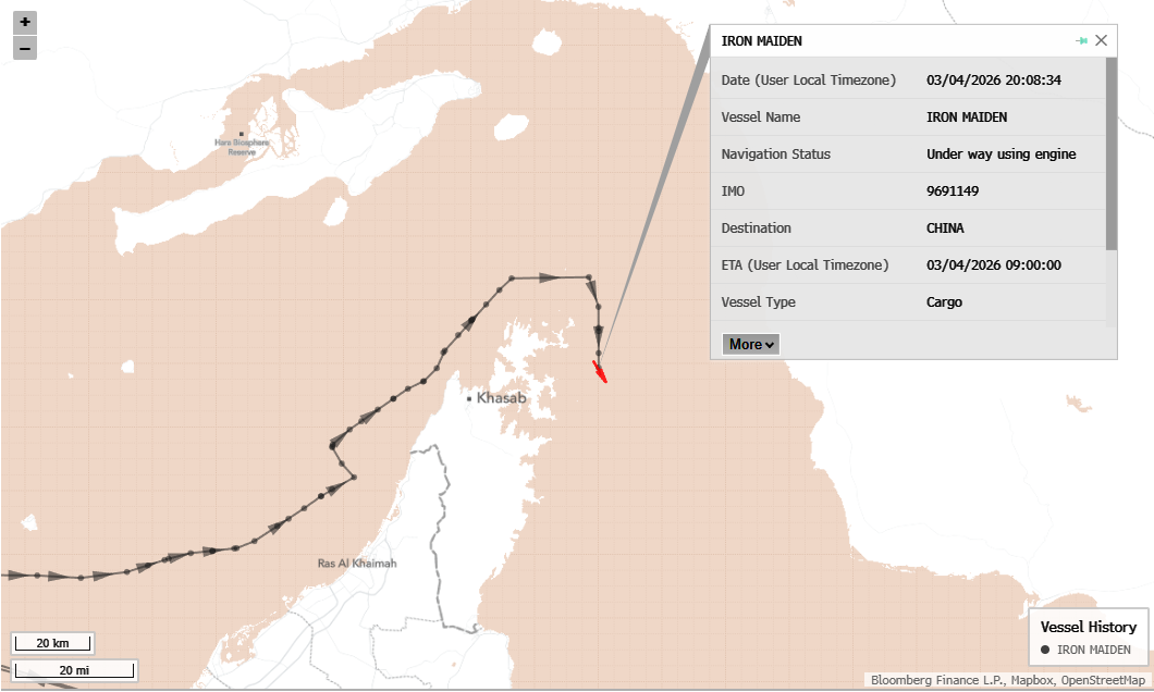 Questa mattina la nave portarinfuse Iron Maiden (usata per trasportare carichi non-liquidi nella sua stiva) ha attraversato lo Stretto di Hormuz modificando il segnale di destinazione da “For Orders” a “CHINA OWNER” mentre procedeva rasente la costa omanita senza incidenti. I dati di tracciamento di Bloomberg e Kpler confermano che la nave si trovava nel Golfo Persico da dicembre 2025 per consegne multiple di materie prime. La società Cetus Maritime Shanghai Ltd., operatrice del mercantile, ha rifiutato ogni commento per motivi di sicurezza dell’equipaggio.