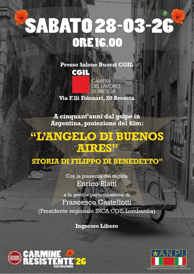 Domani, alle ore 16, nel salone Buozzi della Camera del Lavoro, proiezione del film “L’Angelo di Buenos Aires”, organizzato dalla sezione ANPI “Caduti di Piazza Loggia” nell’ambito di “Carmine Resistente”. Ingresso libero.
