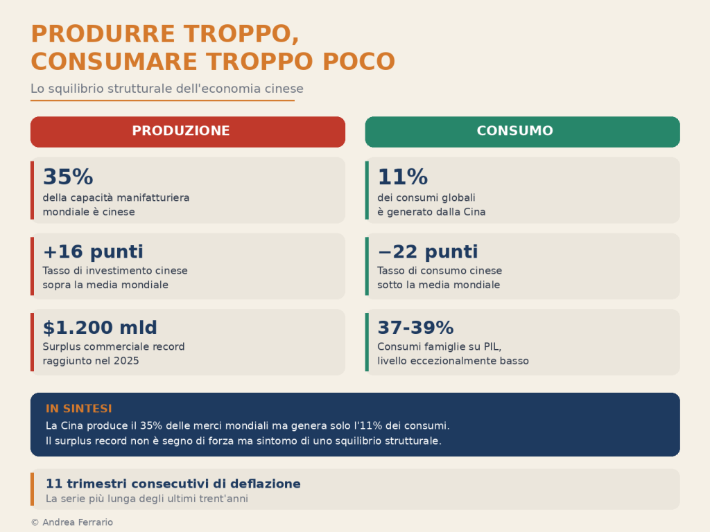Le conseguenze di questo modello si estendono ben oltre la condizione dei lavoratori. Salari compressi significano domanda interna debole, e domanda interna debole significa che l’enorme capacità produttiva cinese deve trovare sbocco altrove. La Cina controlla oggi circa il 35% della capacità manifatturiera mondiale e rappresenta il 18% della popolazione del pianeta, ma genera solo l’11% dei consumi globali. Questo squilibrio tra capacità di produzione e capacità di consumo è alla radice della deflazione cronica che il paese attraversa da undici trimestri consecutivi, la serie più lunga degli ultimi trent’anni, e del surplus commerciale record. La sovrapproduzione a basso costo genera guerre di prezzo tra le imprese cinesi, un fenomeno che il Partito Comunista definisce con il termine “involuzione”, e al tempo stesso inonda i mercati internazionali di merci a prezzi con cui i produttori di altri paesi faticano a competere. La compressione salariale cinese finisce così per danneggiare non solo i lavoratori cinesi, ma anche quelli del resto del mondo.