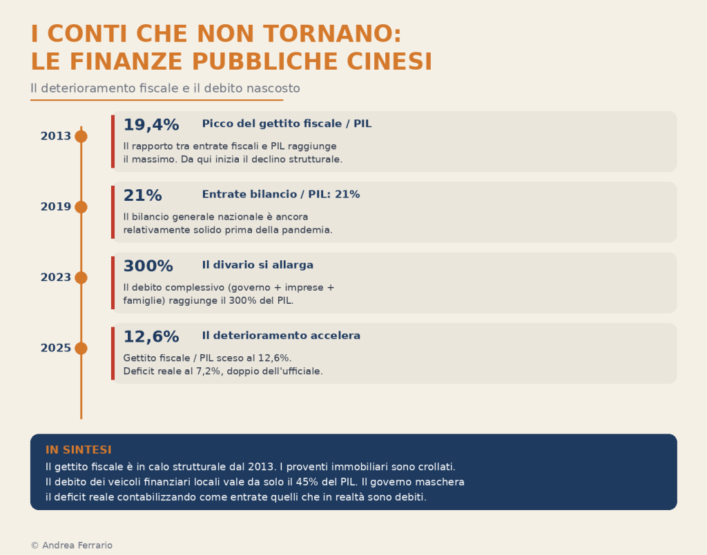 Lo squilibrio tra produzione e consumi si riflette direttamente sulle finanze pubbliche, che rappresentano il secondo grande elemento di fragilità strutturale. Il governo cinese ha dichiarato di voler proseguire con una politica fiscale espansiva, in linea con le indicazioni del quindicesimo piano quinquennale. La domanda è con quali risorse intenda farlo, perché i numeri del bilancio pubblico cinese suggeriscono che lo spazio fiscale disponibile si sta restringendo in modo significativo.