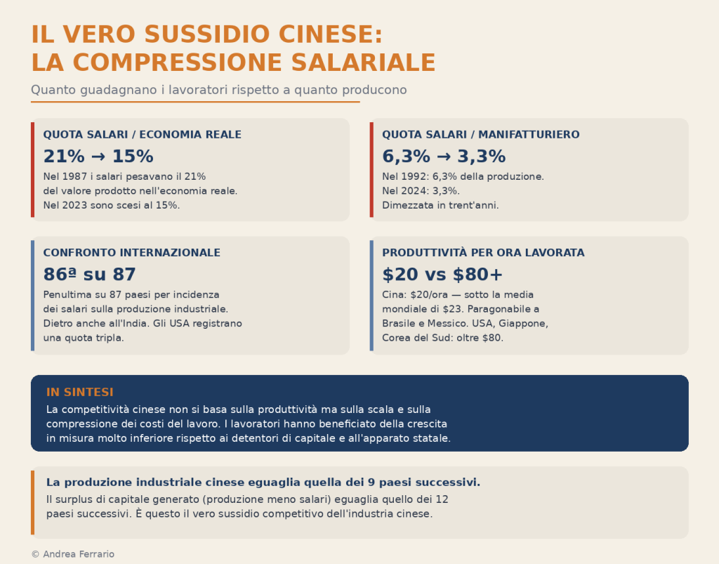 Questa compressione salariale non è un effetto collaterale del successo industriale cinese, è il suo meccanismo fondamentale. Pagare poco il lavoro consente di accumulare enormi surplus di capitale che vengono reinvestiti nella costruzione di fabbriche, infrastrutture, linee di assemblaggio e centrali elettriche. La dimensione del fenomeno è impressionante. La produzione industriale cinese equivale a quella dei successivi nove paesi per volume produttivo messi insieme. Se però si sottrae la quota destinata ai salari, e si guarda quindi al surplus di capitale generato, la Cina eguaglia i successivi dodici paesi. È questo il vero sussidio competitivo dell’industria cinese, molto più rilevante dei crediti agevolati e delle sovvenzioni statali su cui si concentra abitualmente il dibattito commerciale internazionale.