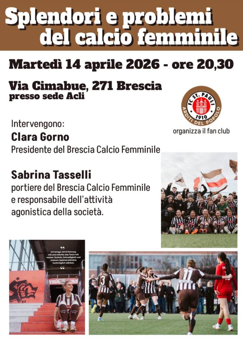 Martedì 14 aprile, alle ore 20,30 , in via Cimabue, 271, a Brescia (c/o circolo ACLI) , il fan club del St. Pauli “Arditi del Popolo” organizza un dibattito sui problemi del calcio femminile. Oltre alle presenti in locandina, parteciperà anche Renzo Ulivieri, presidente dell’Associazione Allenatori di Calcio, già intervenuto a Brescia in novembre ad un’iniziativa sul boicottaggio della squadra israeliana.