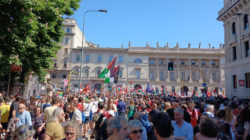 Ma ciò che è stato veramente grave è che tutto ciò ha fatto sì che le 100 o meglio 200mila persone che stavano dietro, siano rimaste bloccate, stipate, sotto il sole, senza sapere il perché. Moltissimi hanno cominciato a svicolare lungo vie laterali; la marea umana si è trasformata, in quanto liquido, in mille rivoli che sono avanzati verso il centro. Molti si sono ritrovati laddove c’era il tappo. La rabbia è cresciuta ancora di più nel vedere e capire perché un corteo enorme fosse stato bloccato. 200 persone che ne fermavano 200mila. Pazzesco. Eppure, c’era un elicottero che volava sopra la testa di tutti, avranno pur visto benissimo la situazione grave e anche pericolosa che si stava verificando. Nulla.